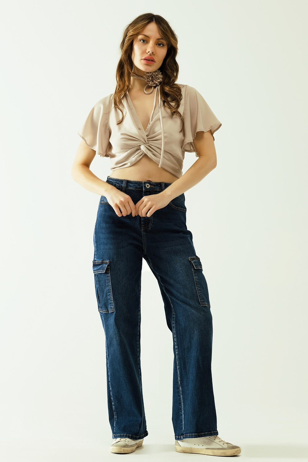 Beige V-neck crop top with short sleeves and a flower detail on the neck