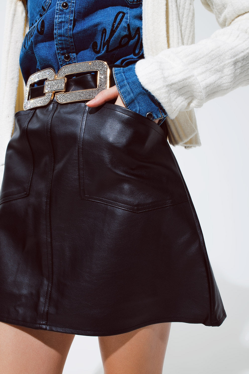 black Leatherette mini skirt with pockets