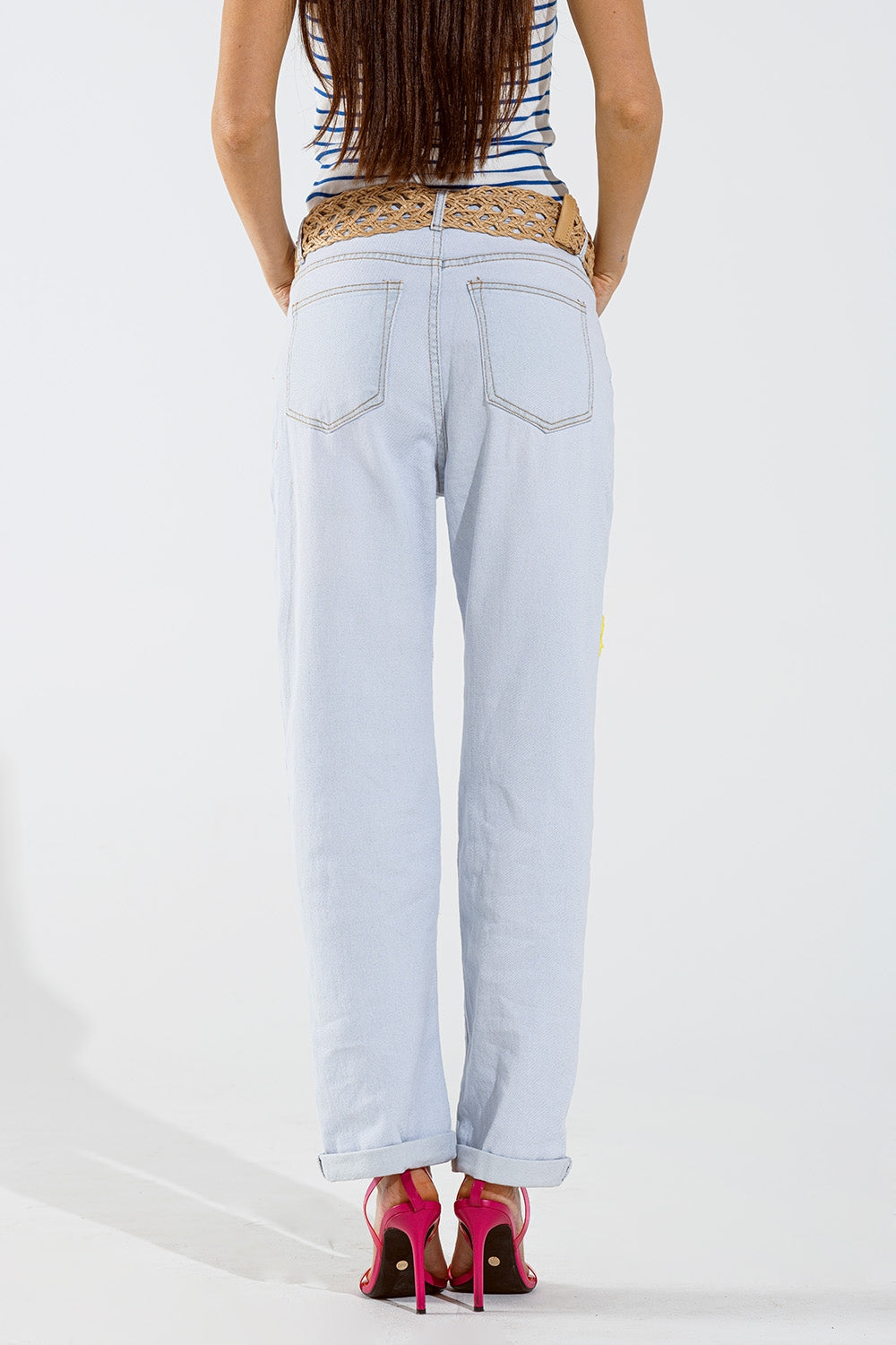 Bleached Relaxed Jeans With Multicolor Floral Design