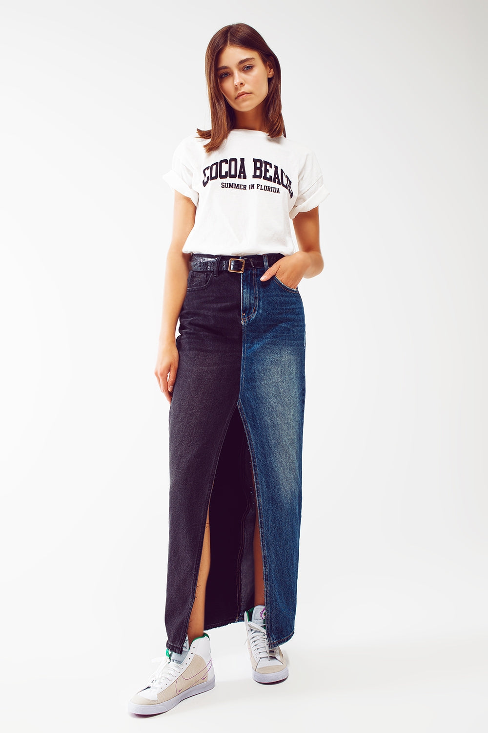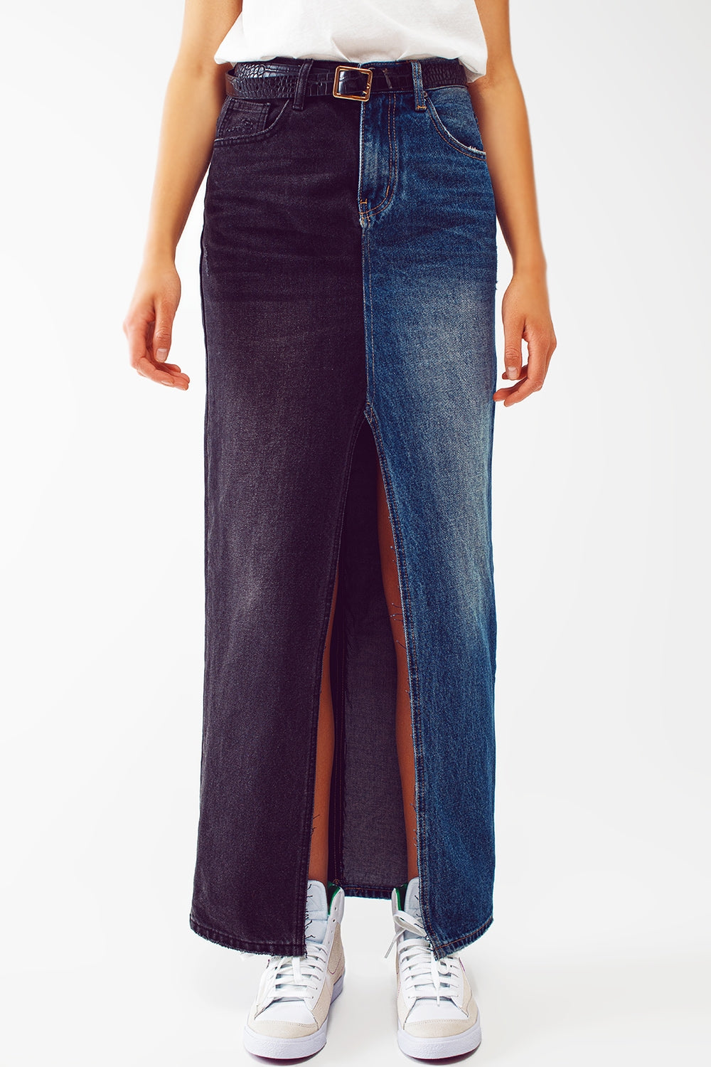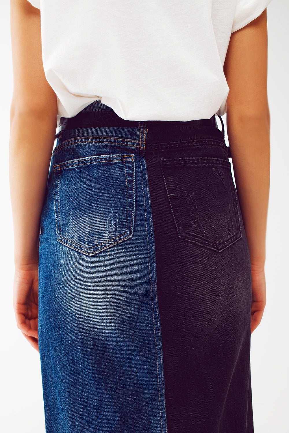 blue and black block denim skirt