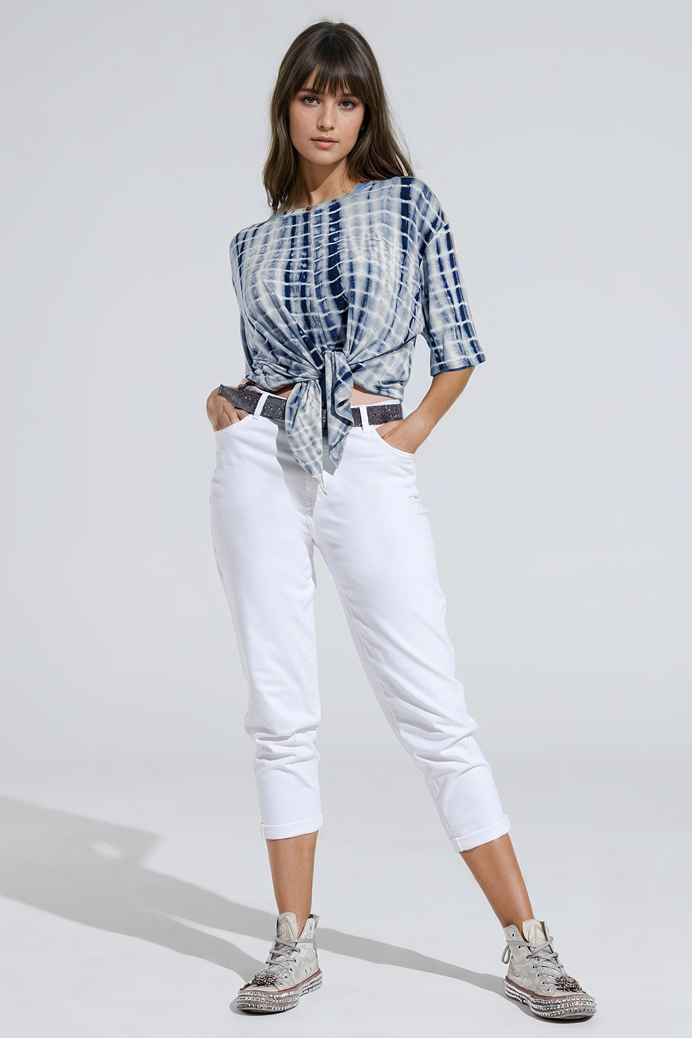 Length: Cropped length. Subcategory: Top. Collar: Crew neckline. Sleeves: Short Sleeves. Print: Tie-dye print. Fit: Relaxed fit. Style: Boho. Fabric: Lightweight woven fabric . Product details: Tie-keyhole front. runs true to size. S.