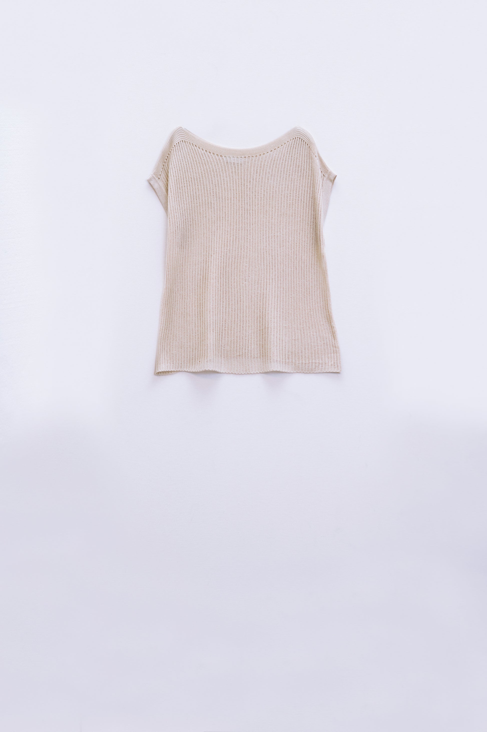 Boat Neck Ribbed Sweater With Cap Sleeves in Beige