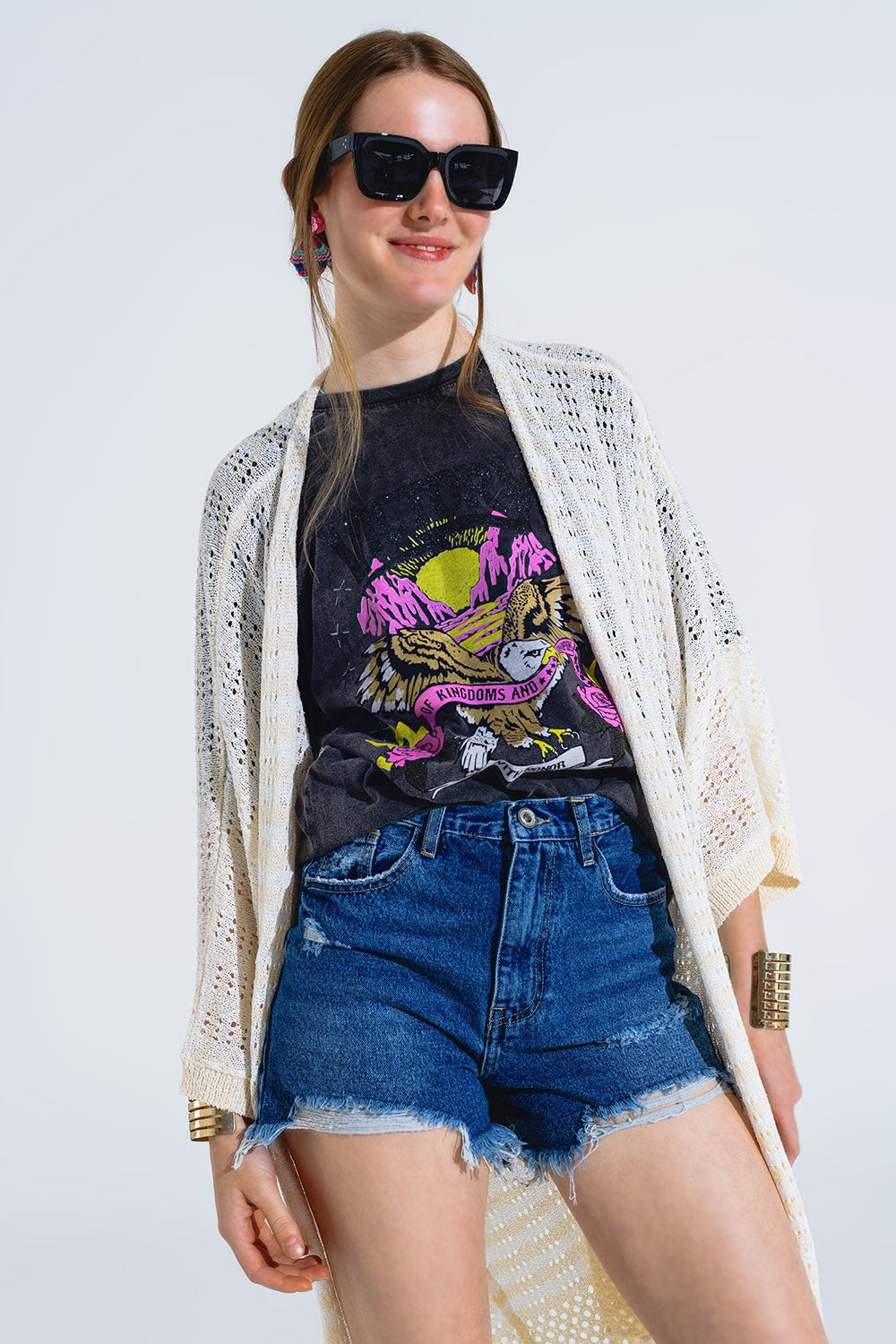 Cream Boho Style Cardigan With Stripes Pointelle Knit and Fringe Details