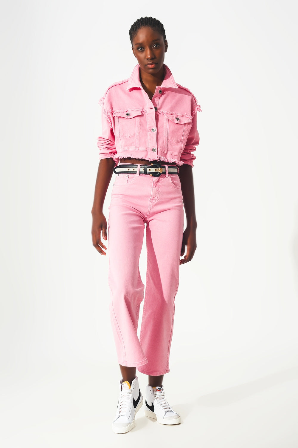 Length: Cropped length. Subcategory: Denim jacket. Collar: Wide collar neckline. Sleeves: Long Sleeves. Style: Casual. Jean type: Distressed design. Fabric: Stretch denim. Pockets: Chest pockets. Zipper: Button placket. Seam: Frayed ends. Product details: Functional pockets. runs true to size. S.