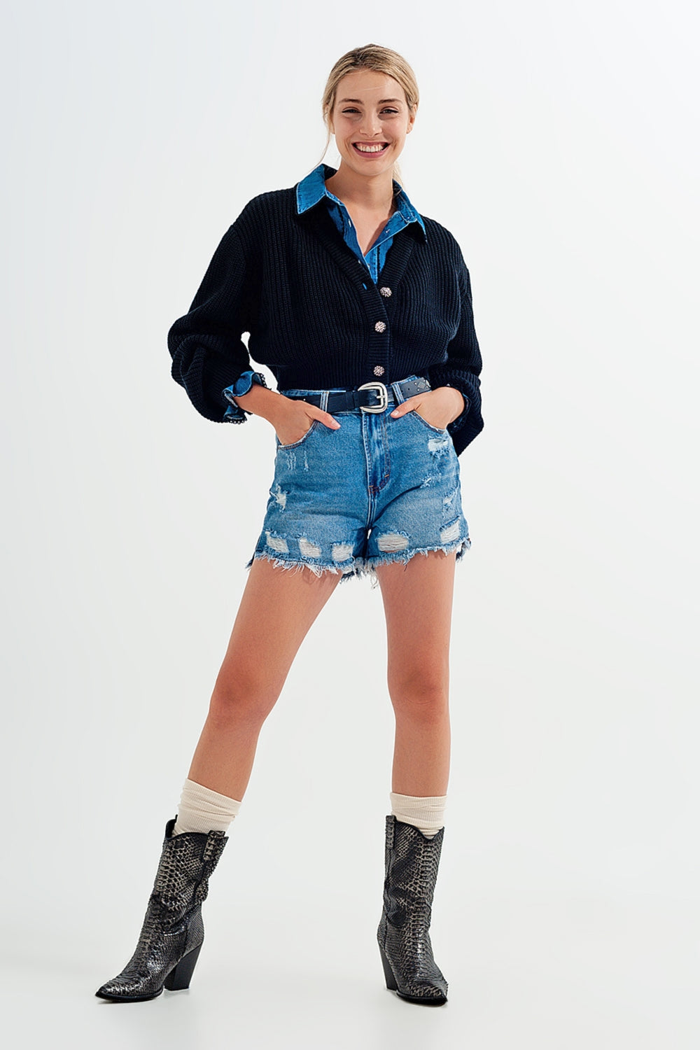 Length: Cropped length. Subcategory: Cardigan. Collar: V-neck neckline. Sleeves: Long Sleeves. Fit: Standard fit. Style: Comfy. Detail: Strass detail. Fabric: Chunky knit. Zipper: Button placket. runs true to size. S.