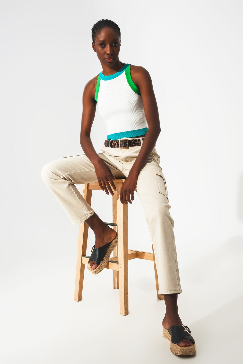 Length: Cropped length. Subcategory: Top. Collar: Crew neckline. Sleeves: Sleeveless style. Fit: Bodycon fit. Style: Daily. Fabric: Ribbed knit. runs small. S.