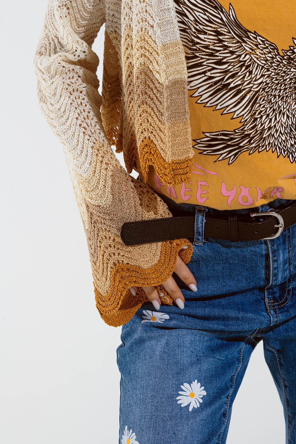 Short knitted cardigan with angel sleeves and wave multicolor detail in beige
