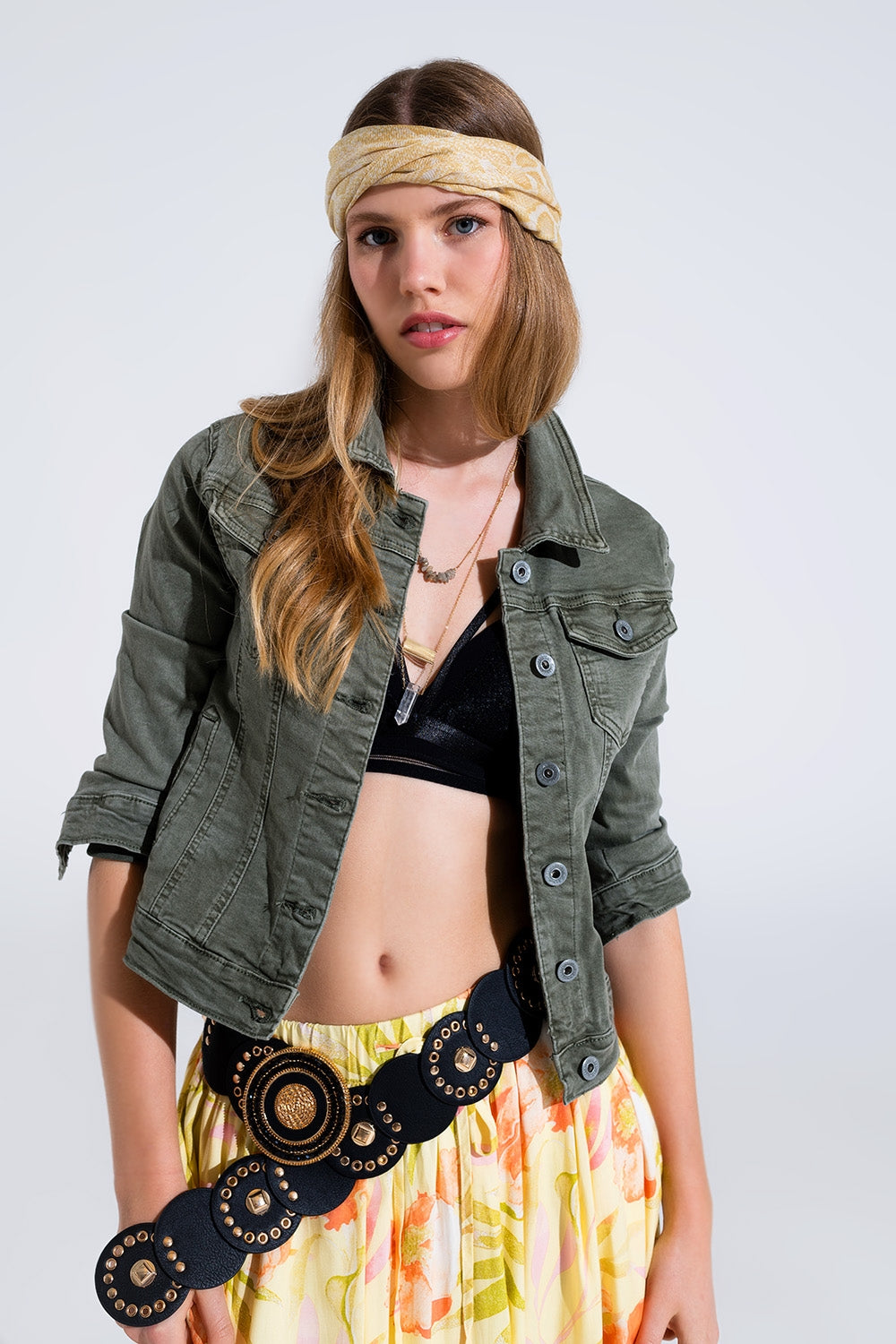 Subcategory: Denim jacket. Collar: Wide collar neckline. Sleeves: Long Sleeves. Fit: Bodycon fit. Style: Casual. Fabric: Stretch denim. Pockets: Chest pockets. Zipper: Button placket. runs small. S.