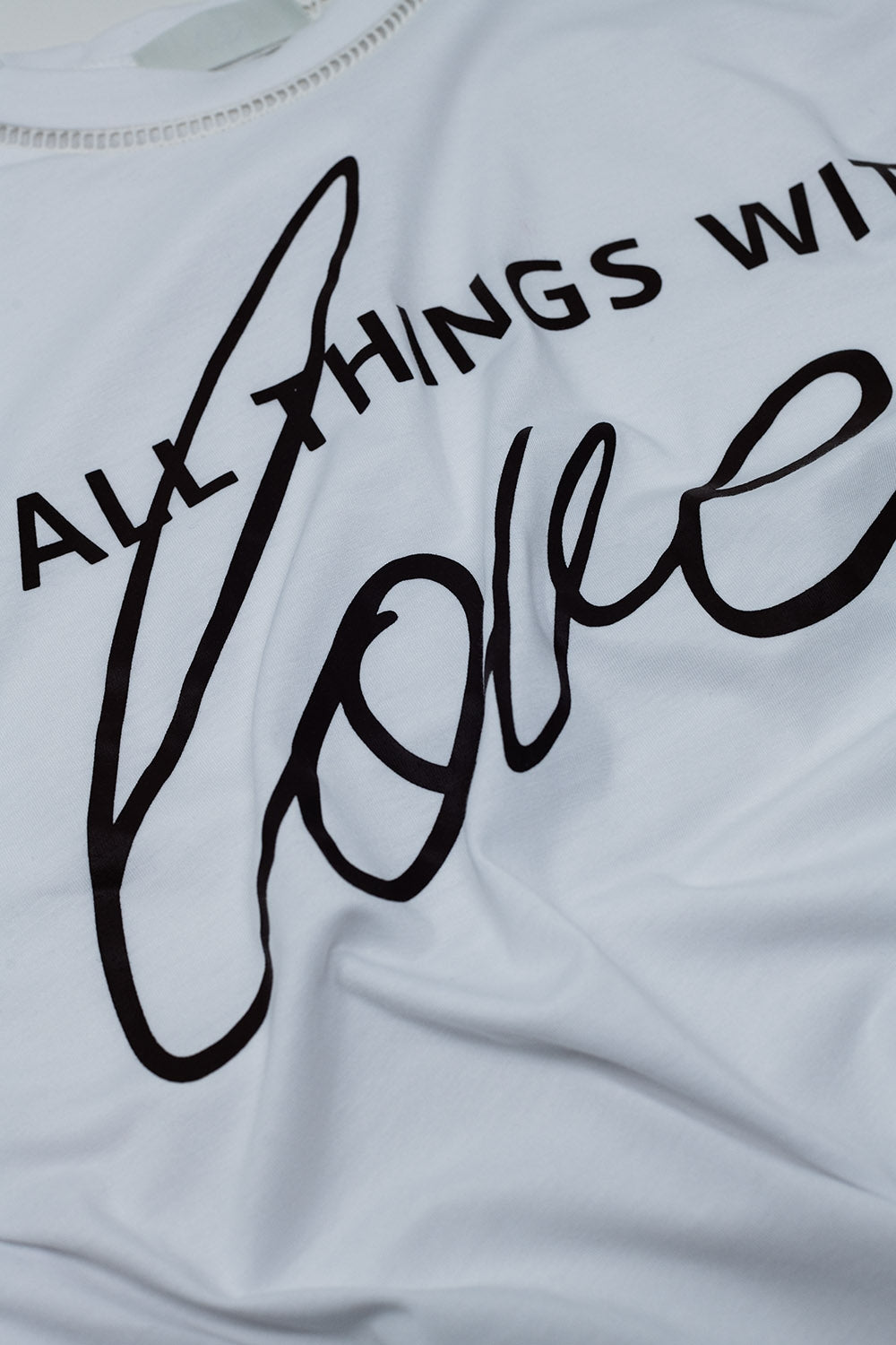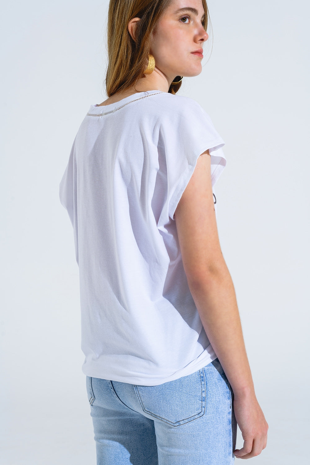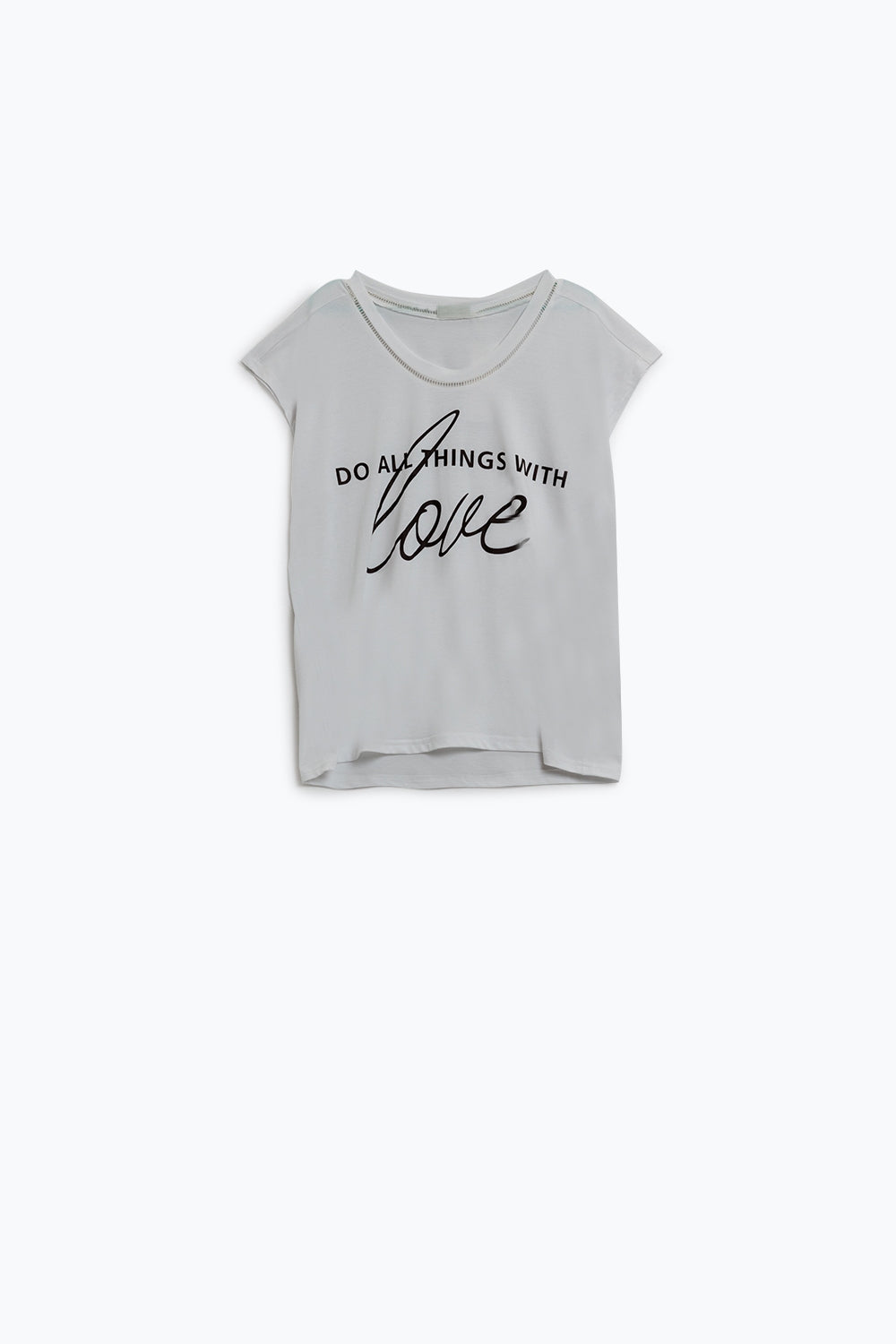 White T-Shirt With Black Text At The Front and Trim at The Neck