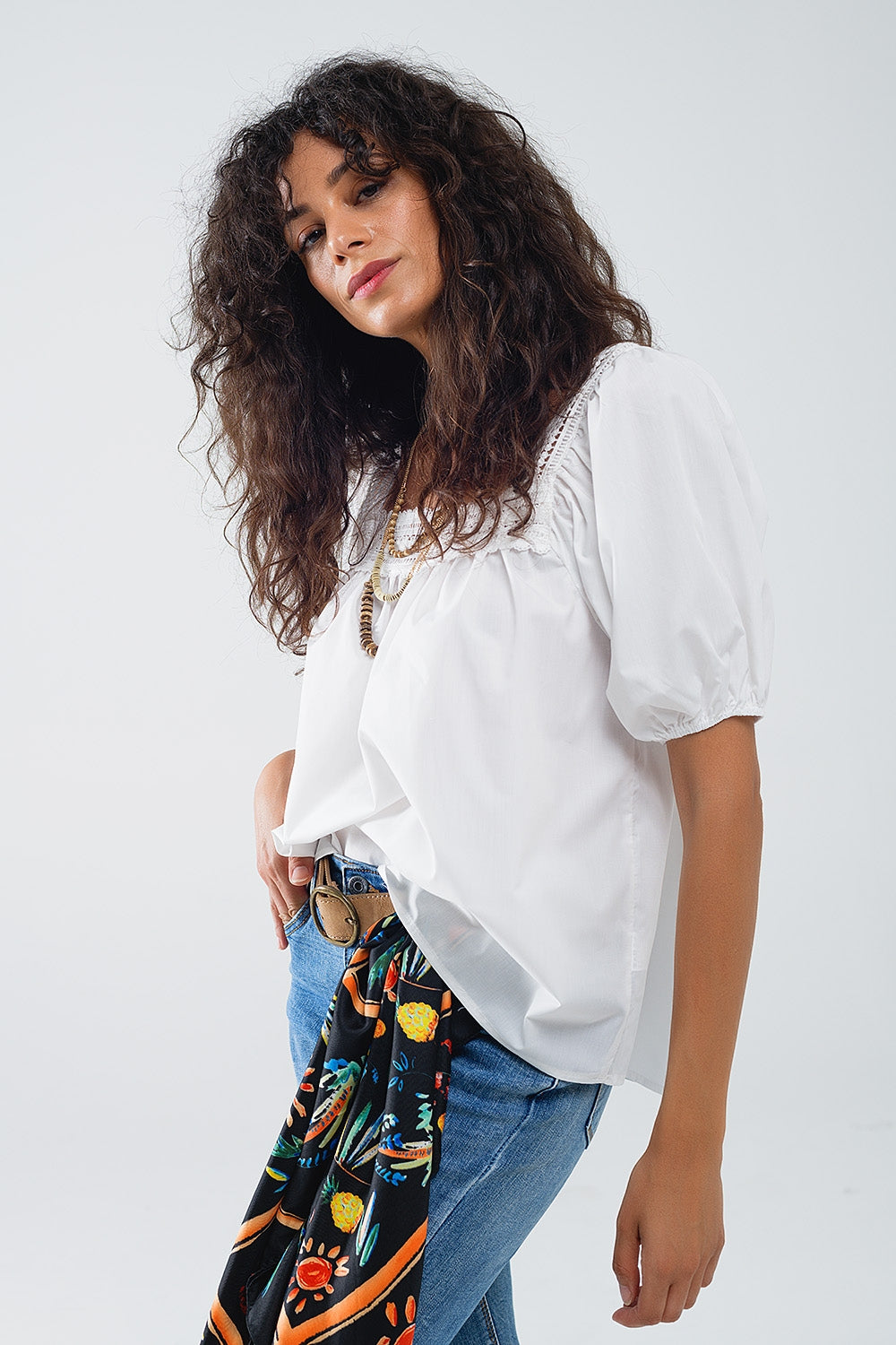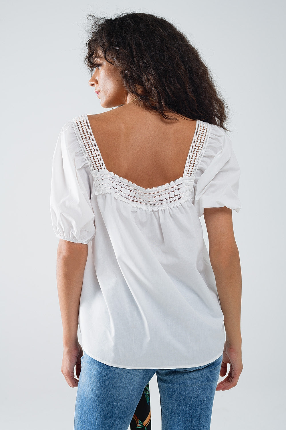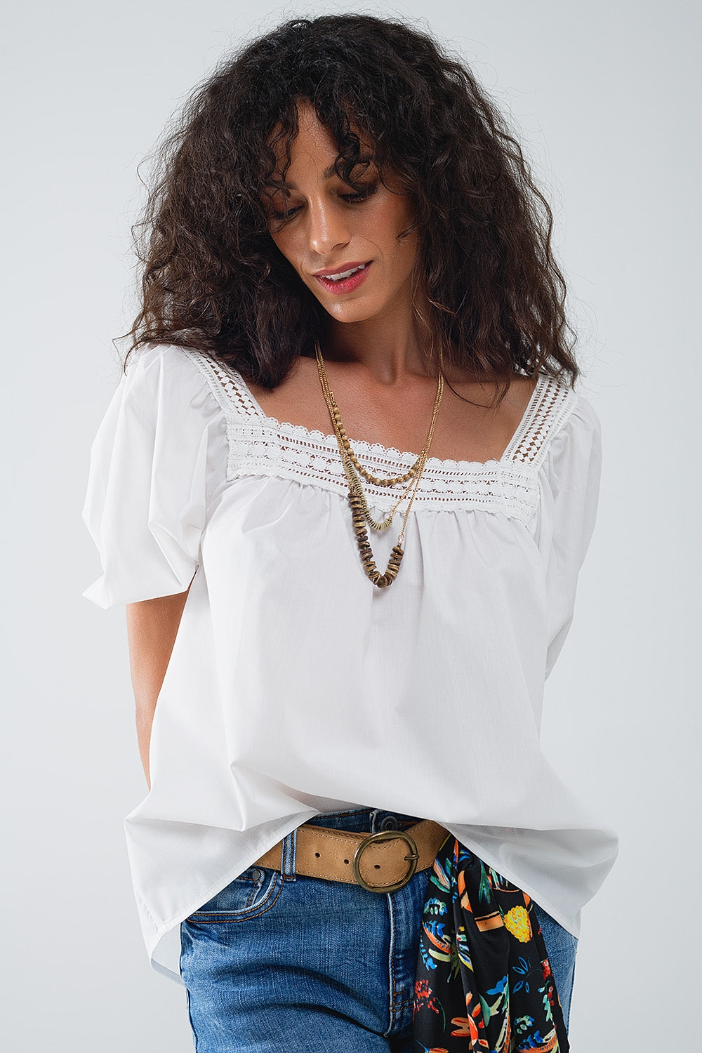 Subcategory: Top. Collar: Square Neckline. Sleeves: Ruched volume sleeves. Fit: Relaxed fit. Style: Boho. Fabric: Poplin. Seam: Lace trims. runs true to size. S.