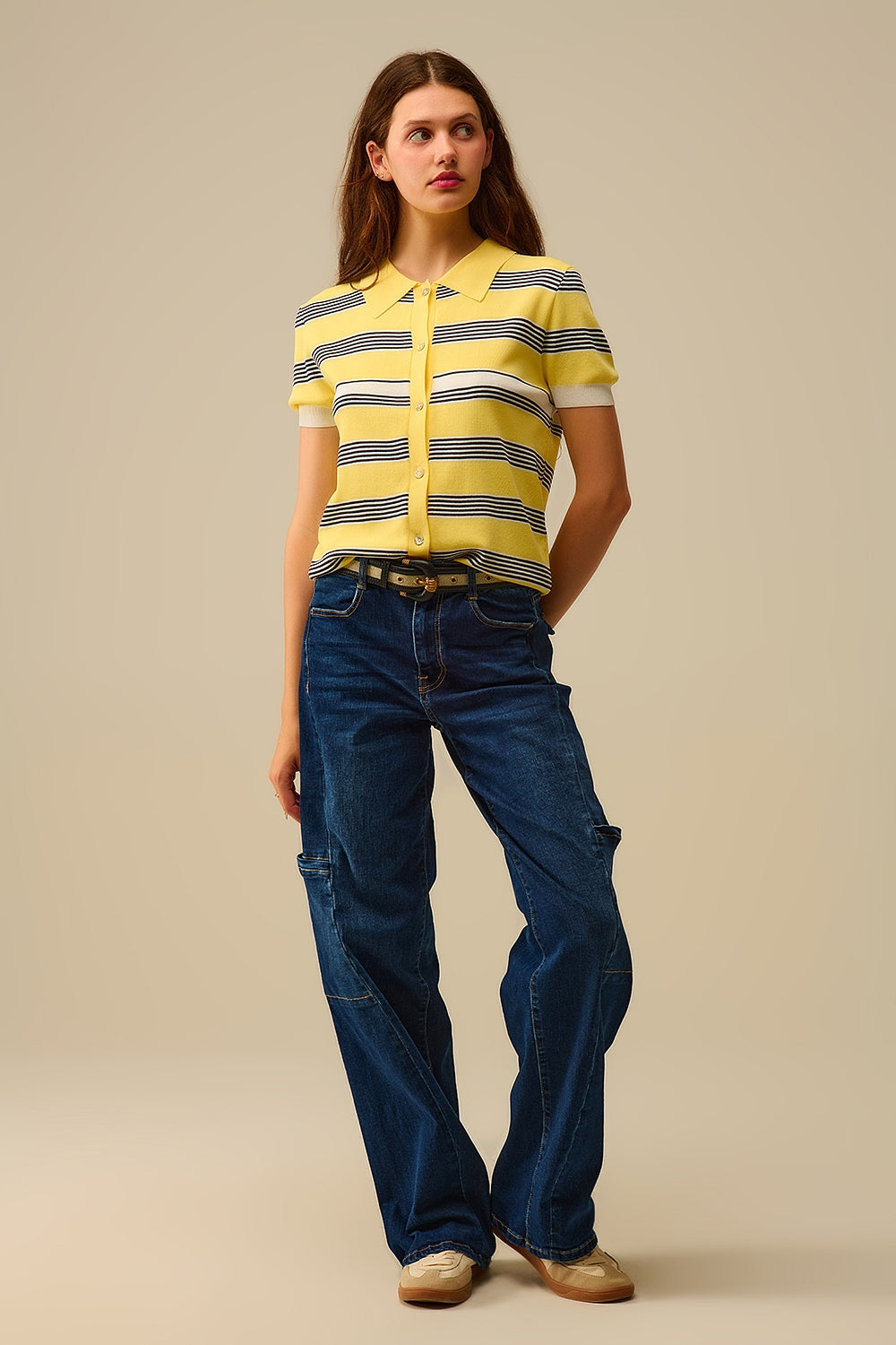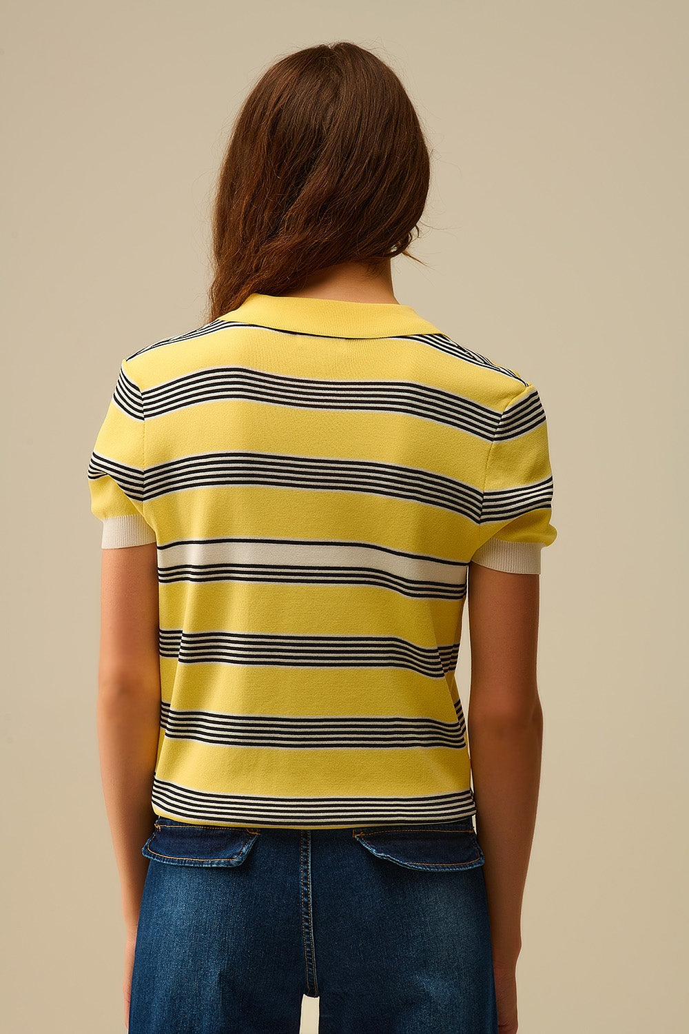 Subcategory: Top. Collar: Polo collar. Sleeves: Short Sleeves. Print: Stripe design. Fit: Standard fit. Style: Daily. Fabric: Fine Knit. runs true to size. S.